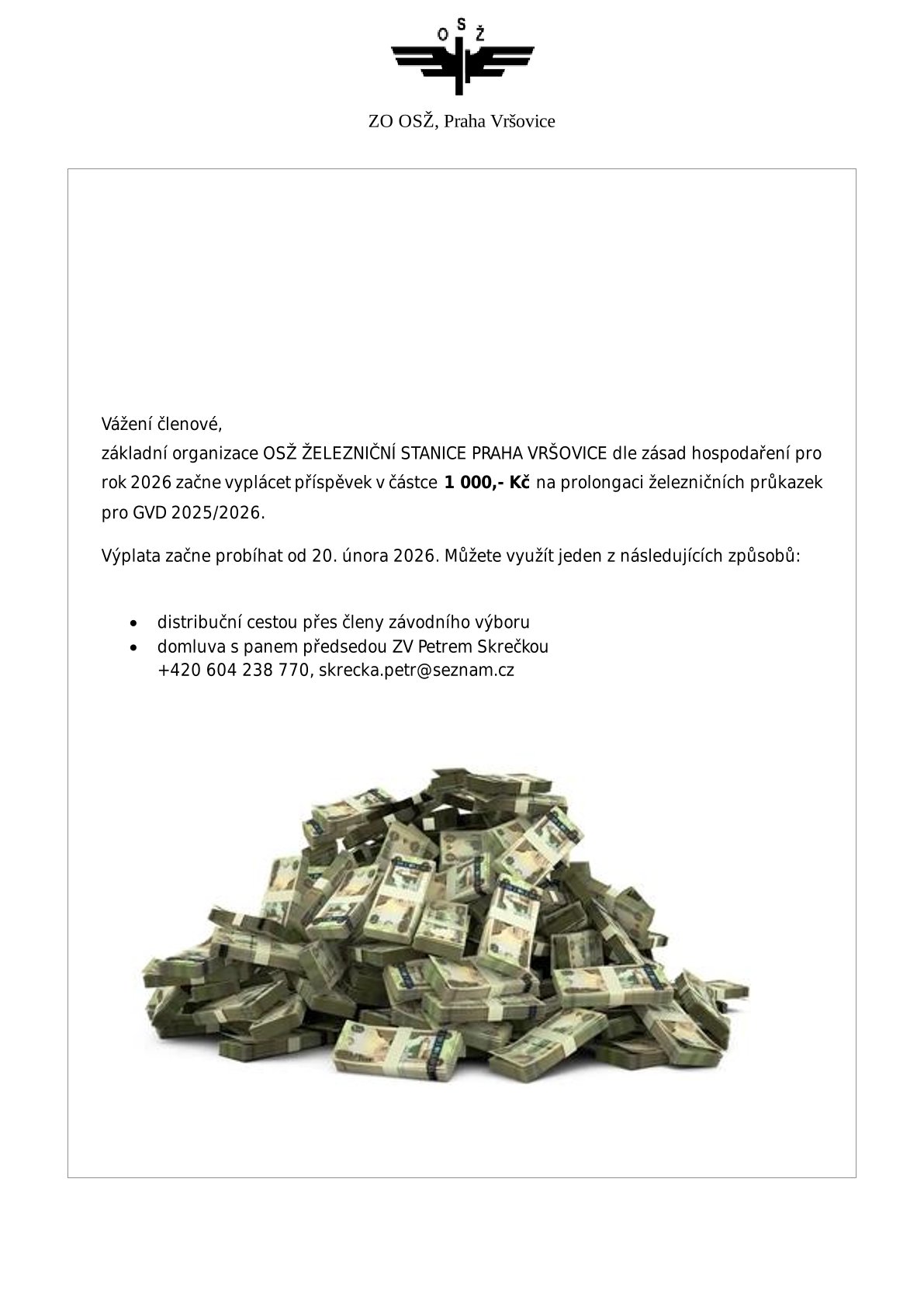Výběrčí tržeb p. Dvorská v Praze hl.n. denně 8:00 - 14:00 tel.: 702 246 039 a předseda ZO Petr Skrečka po telefonické domluvě tel: 604 238 770 popř. mail skrecka.petr@seznam.cz .